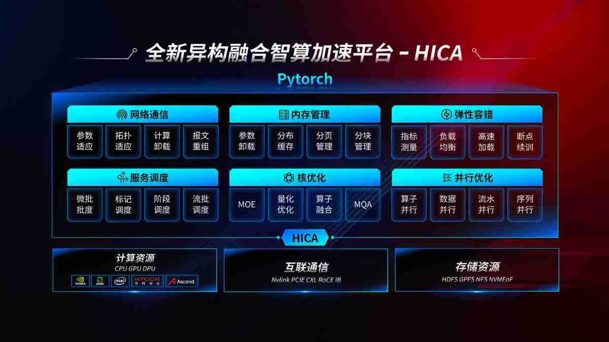 通过自研的服务层、、中间适配层、、以及调度编排算法,,采用数据并行、、模型并行等多种并行方式,,,把并行计算任务进行有效的分解,,,使其分别由相应的软件栈和算力资源来承接。。当GPU资源变化,,HICA可以实时动态调度计算子任务并调整模型拓扑和架构,,,以充分聚合各种算力资源。。。